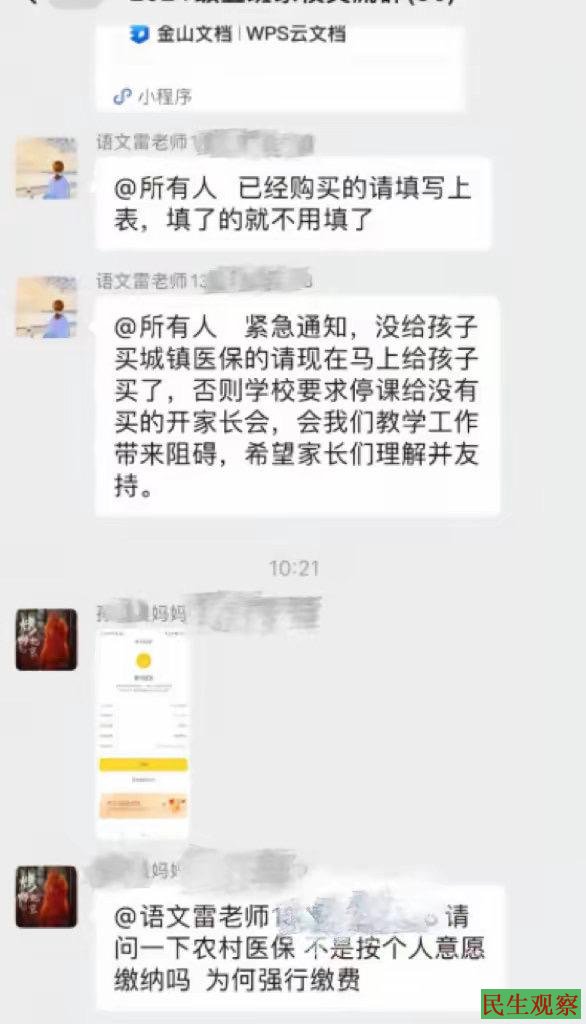 马上谈:小学班主任被指在家长群强推医保:不买学生停课,家长开会。当地回应:自愿购买,买了就医有保障。家长:你不买,天天群里催,小孩都被区别对待了,不买不行啊…锅是当地令学校强推,指不定有百分比任务;班主任也是被派发任务,无奈但是态度是真差…