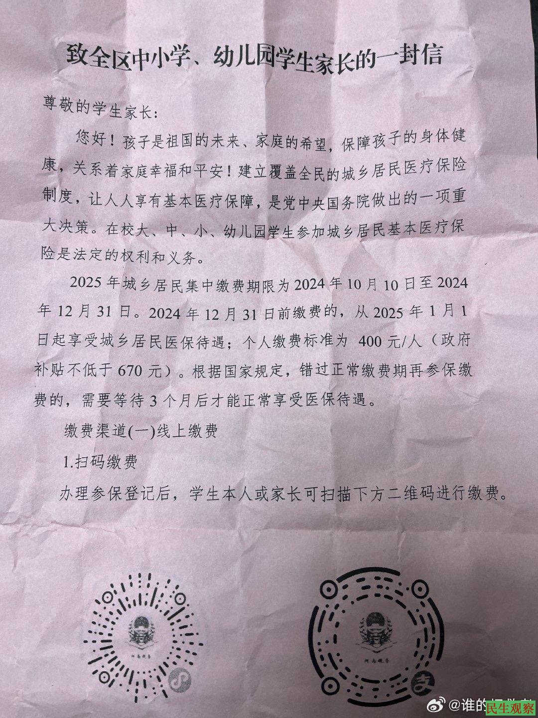 谁的拯救者:这是昨天幼儿园的老师让孩子带回家的,其中有句话“在校大中小幼儿园学生参加城乡居民基本医疗保险是法定的权利和义务”这句话对吗?什么时候参加基本医疗保险是义务了,早上幼儿园教师还在群里让填表,让每个家长交钱,孩子什么也不懂只再三提醒让我们送上学的时候给老师说我们知道了,让我觉得有拿孩子要挟的意思(我们其实提前几天已经缴了)居民医保现在已经涨到400了,很多人都觉得贵了不打算交,正常的逻辑应该是降费让大家觉得划算去交,或者扩大医保范围或增加报销比例优化医保,但医保方却选择第三条路,通过学校让孩子给家长带资料,然后在群里统计逼迫家长交费,这真的很中国。