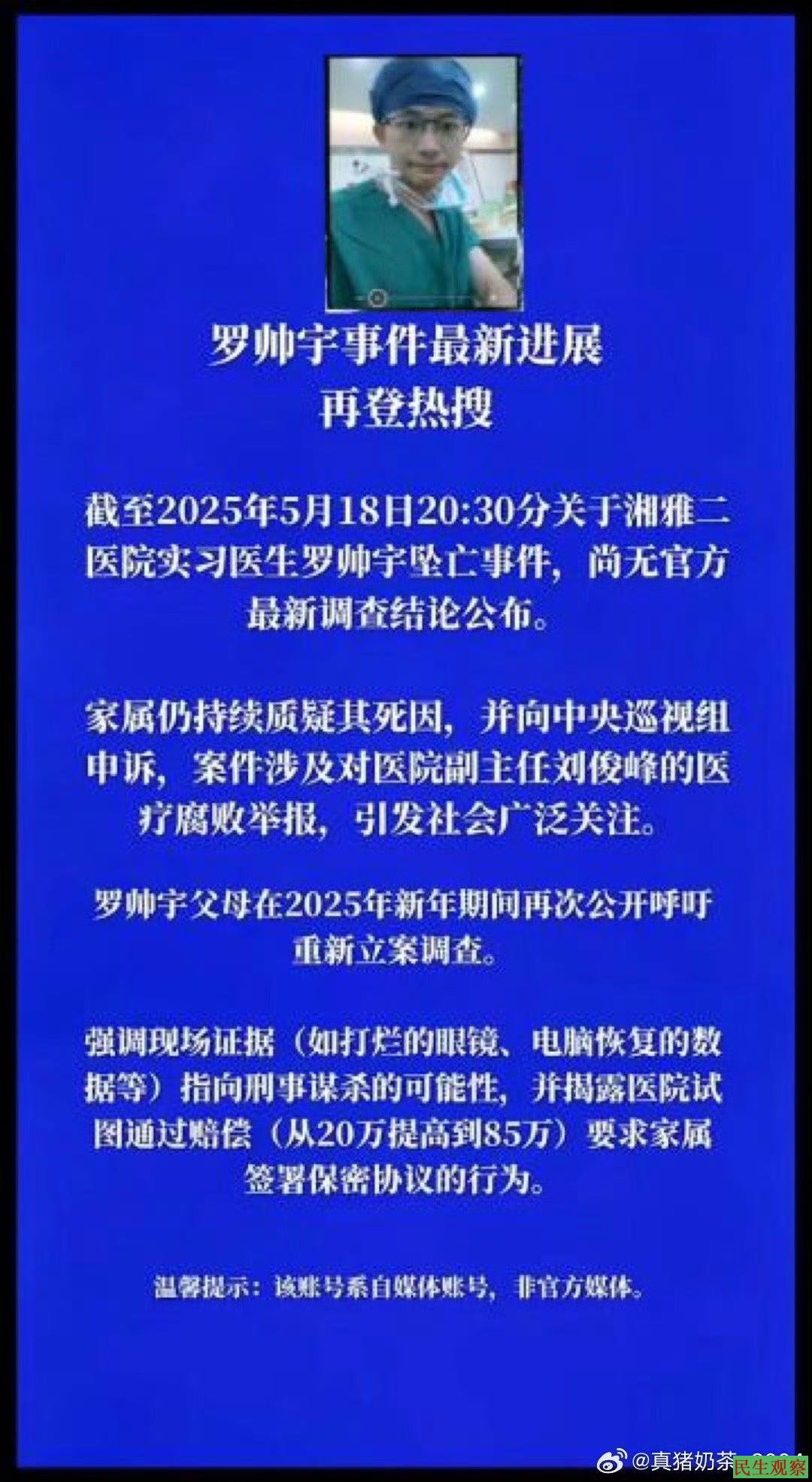 2025年5月8日是罗帅宇医生离奇坠亡的一周年祭日。国内多个平台转发罗帅宇医生生前录取的相关人员非法获取供体配件的现场录音,及活摘倒卖人体器官牟取巨大利益罪恶链条,录音很快被限流和屏蔽。罗帅宇2021年以硕士身份考入全国顶尖移植科室湘雅二医院肾移植科实习,发现湘雅医院活摘倒卖人体器官牟利的非法活动,在举报的过程中在2024年5月8日凌晨宿舍楼的离奇坠亡。家属在处理后事过程中发现并整理出16斤的举报材料,嗣后,医院试图通过经济补偿掩盖真相。众多网友表示罗帅宇医生事件揭开人口失踪之谜,为人抱薪者,不可使其冻毙于风雪。