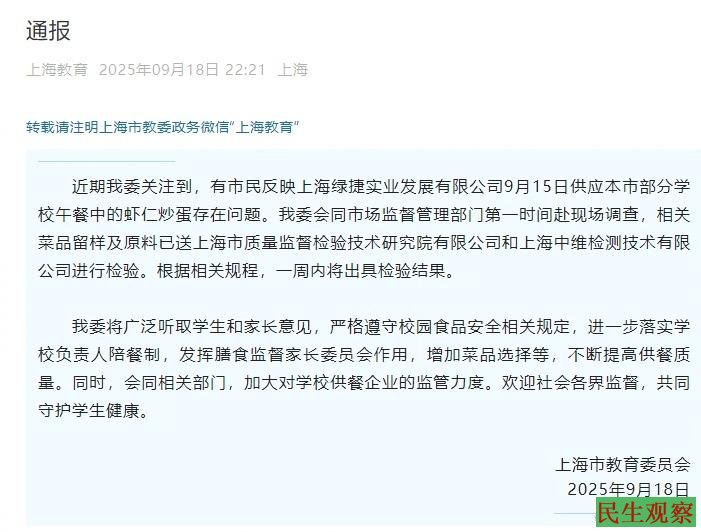 9月18日,上海市教育委员会发布通报:我委会同市场监督管理部门第一时间赴现场调查,相关菜品留样及原料已送上海市质量监督检验技术研究院有限公司和上海中维检测技术有限公司进行检验。根据相关规程,一周内将出具检验结果。
