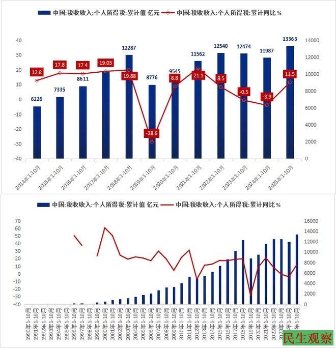 持续增长趋势:2025年至今,个人所得税收入几乎每个月都实现同比增长,显示出明显的增长态势。