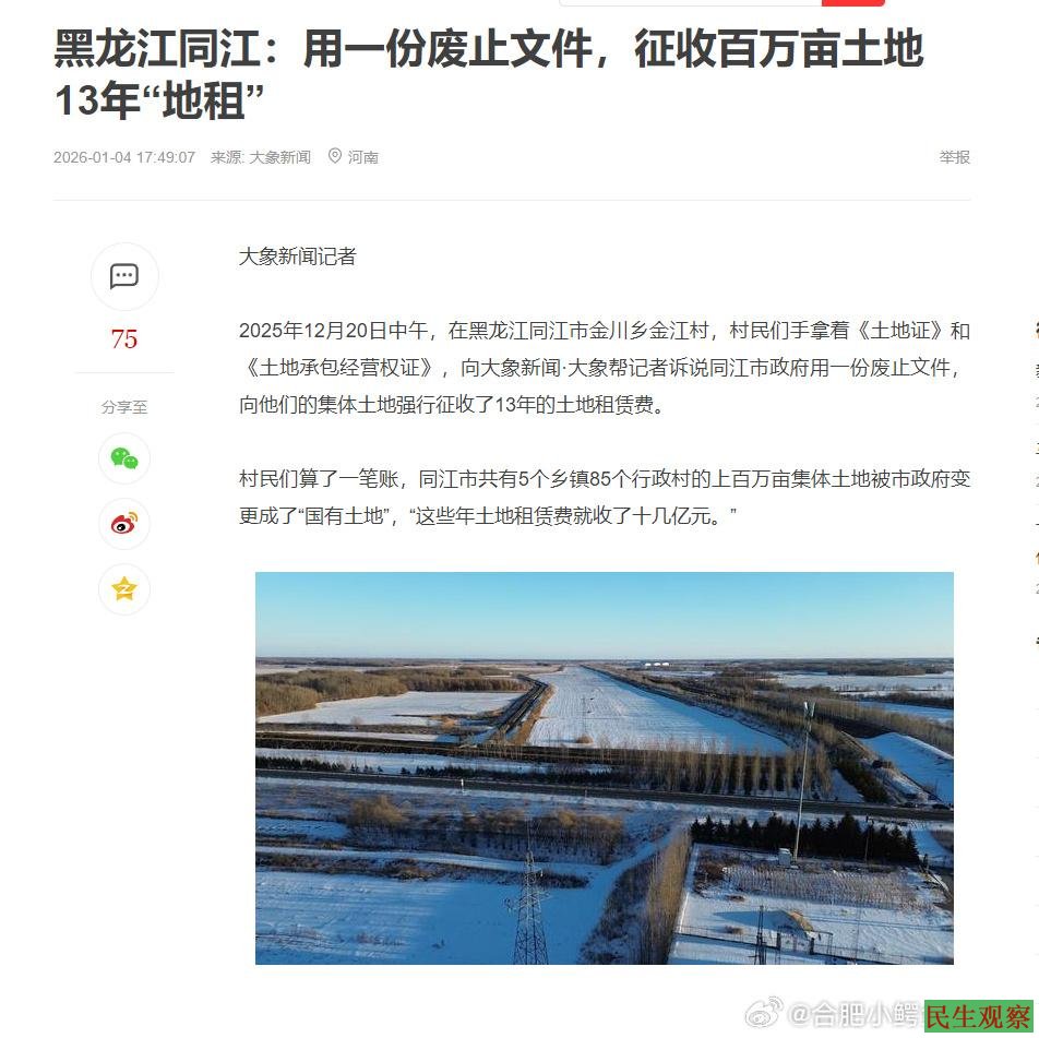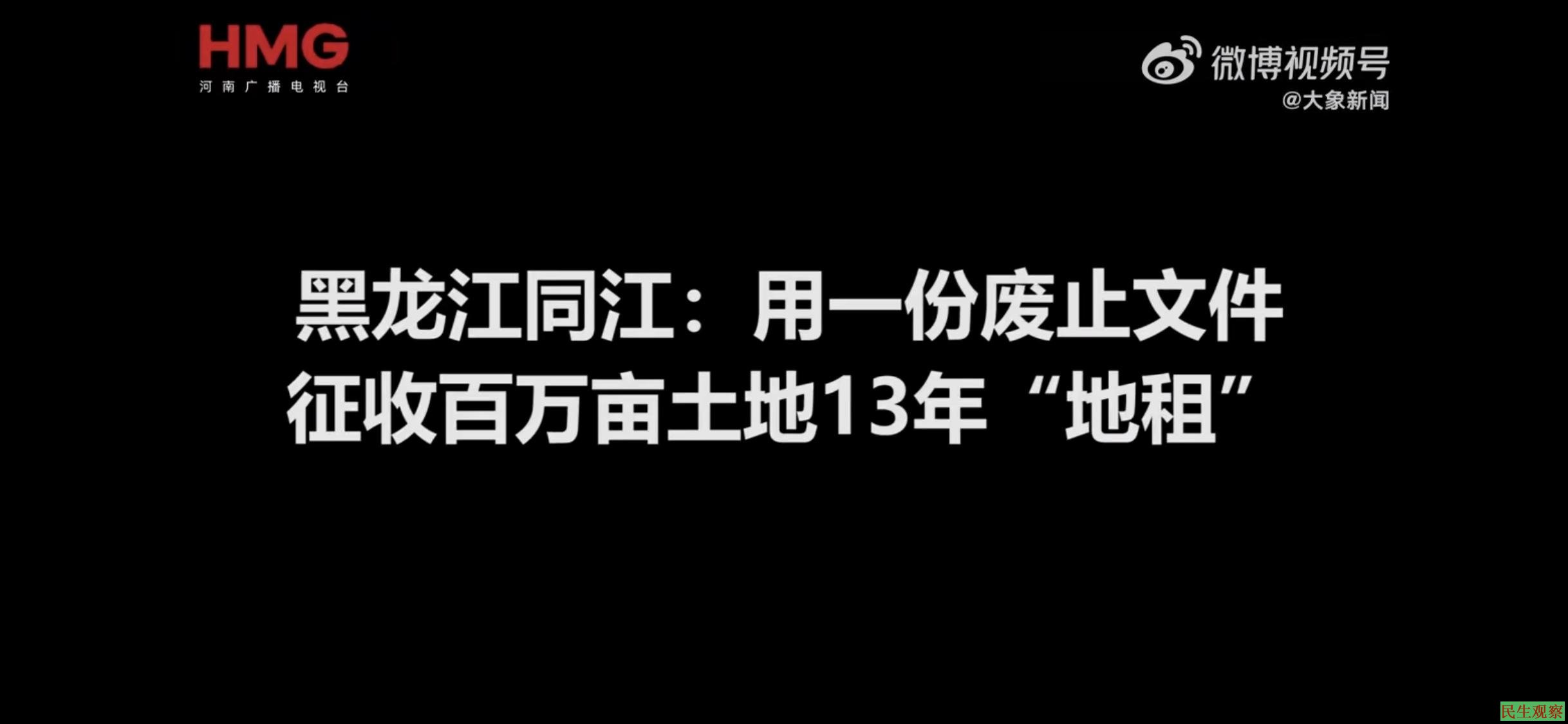#十几亿去了哪里#大象新闻:黑龙江省同江市,村民集体土地被同江市政府用一份废止文件变更为“国有土地”,每亩要缴纳上百元土地租赁费。