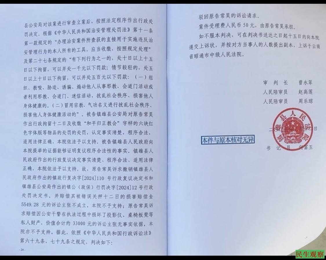 【民生观察2025年3月28日消息】云南省镇雄县常昊传道因不服公安机关的行政拘留处罚而发起诉讼。近日,常昊传道收到了云南省镇雄县人民法院的行政判决书,结果是驳回诉讼。书记员问常昊服不服,常昊说不服,他还要上诉,书记员让常昊签字盖手印后拿走了判决书。