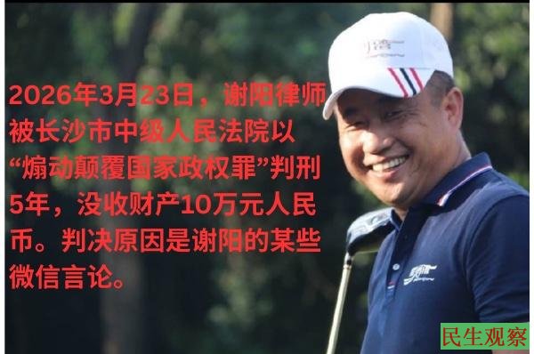 据谢阳妻子陈桂秋发文表示,“2026年3月23日,谢阳律师被长沙市中级人民法院以‘煽动颠覆国家政权罪’判刑5年,没收财产10万元人民币。