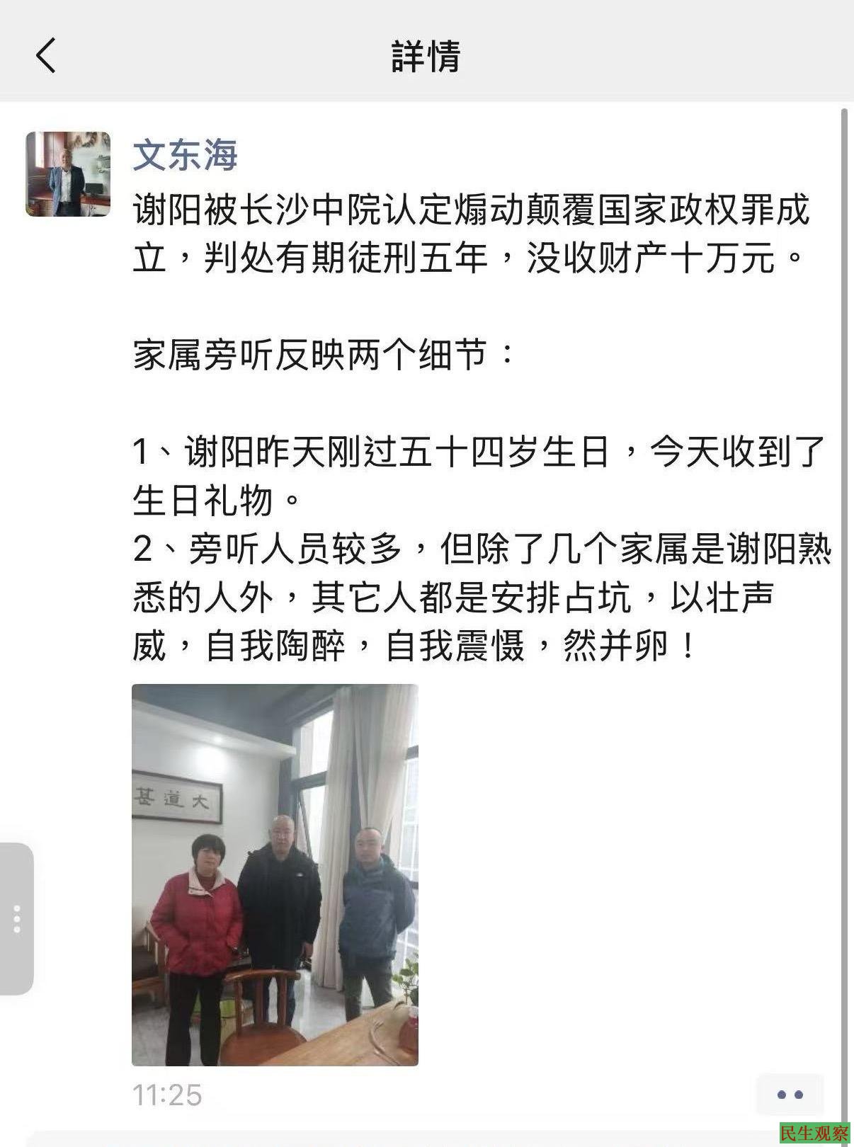 与此同时,湖南维权律师文东海也发文表示,“谢阳被长沙中院认定煽动颠覆国家政权罪成立,判处有期徒刑五年,没收财产十万元。