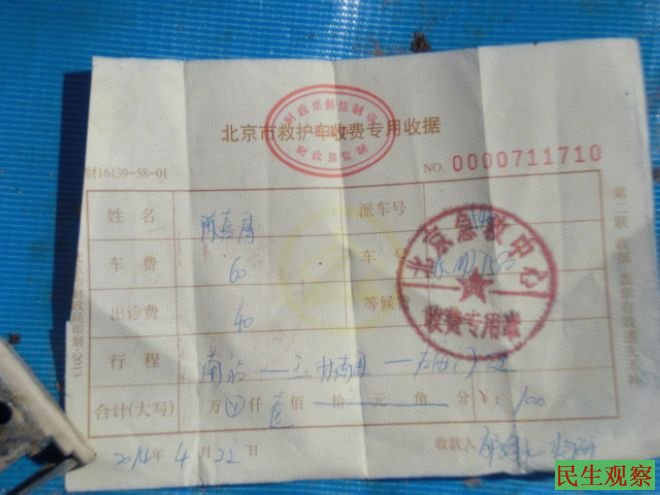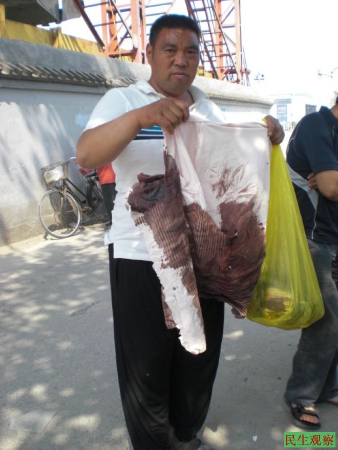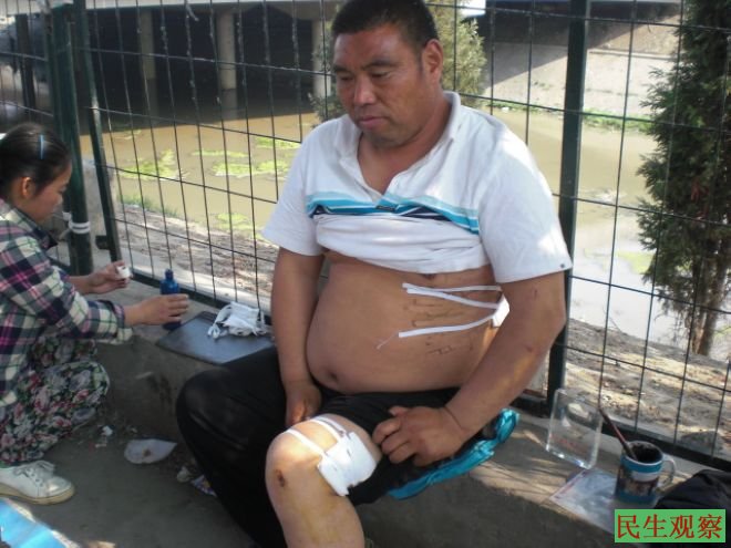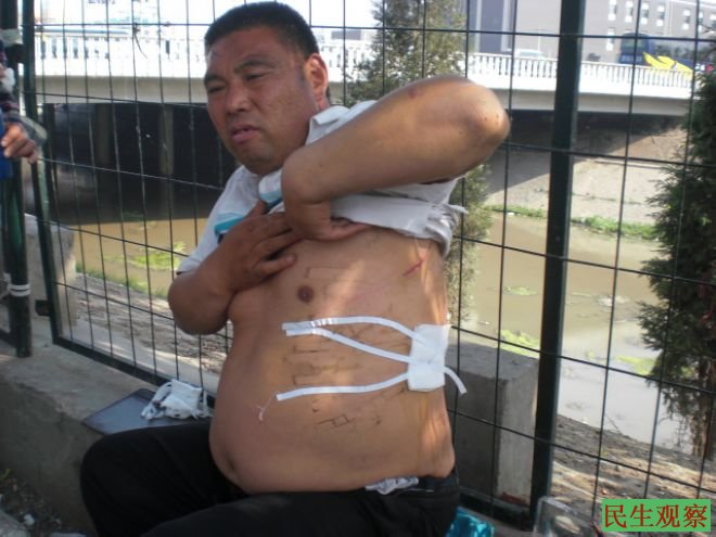 民生观察工作室2014-5-2消息:今年4月22日晚12点左右,河南郑州访民陈喜昌在北京南站开阳里早市门口被4人追赶堵截持刀砍伤。陈喜昌告诉本工作室志愿者,这四个人都是年青小伙子,他不认识。这些人见到他后把他拉到面包车门边就对他砍了五刀,腰部、腿部都被砍。