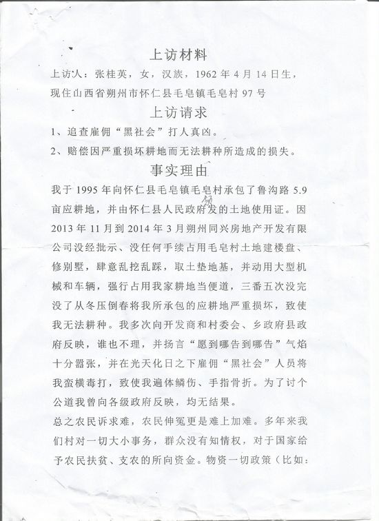 张桂英反映,20 1 3年11月到20 1 4年3月朔州同兴房地产开发有限公司没经批示、没任何手续占用毛皂村土地建楼盘、修别墅,肆意乱挖乱踩,取土垫地基。并动用大型机械和车辆,强行占用他家耕地当便道,致使无法耕种。张桂英多次向开发商和村委会、乡政府县政府反映,没人理会,还扬言“愿到哪告到哪告”。张桂英一气之下到国家信访局反映,信访局还要让她回地方解决。