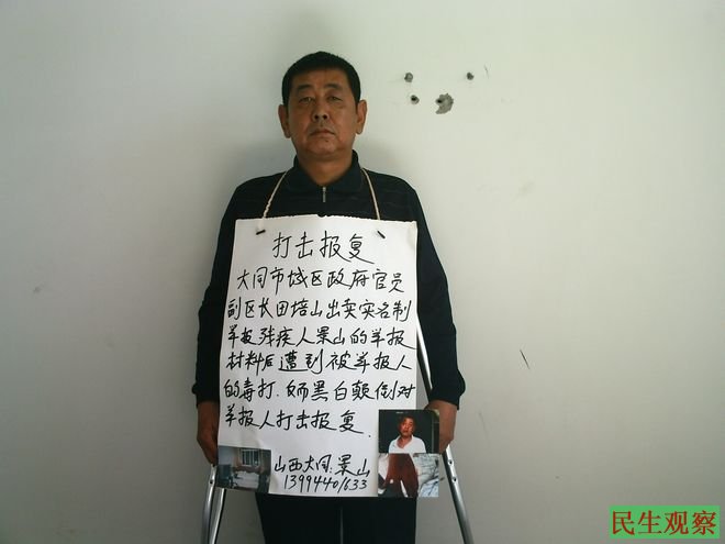 山西大同残疾人景山诉举报遭打反入狱一年 |