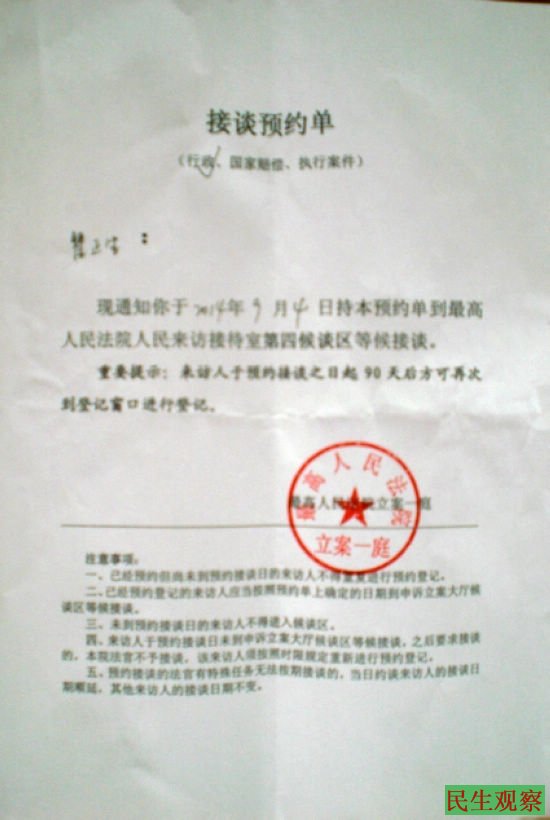 湖北十堰访民瞿正生说,他拿着约谈单在高法等了一上午都没等到给他接谈。他说,他9点20 分就进入接谈大厅等着,等到11点时,把他们那个厅的70多人都赶了出来,一个也没谈上,其他厅还有100多人在等。这期间瞿正生还敲办公室的门问了几次,都说让等着,到往外赶他们时法警才说,电脑都坏了,没法办公。几个访民索性在高法门口高喊,司法腐败,高法院长办假案,并拦截从高法出来的车,被警察挡住。