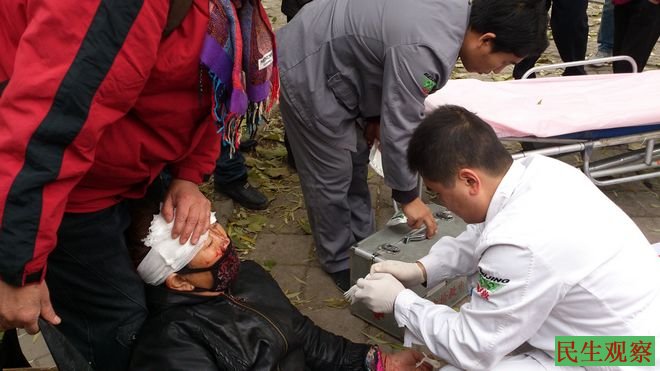 据在场访民说,警察不给登记,他就摆上了地状,和他一起摆地状自杀的还有一个女的,女的把头和手腕都割破了,几十个访民围过来报警施救,谴责强权当道民不聊生。警方查验过了自杀的两人身份,999救护人员给女访民简单包扎后,抬上救护车,服毒的访民也一起带走。