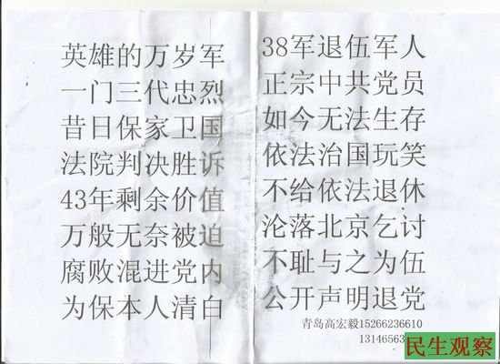 山东退伍军人高宏毅要求退党被驻京办带走 |