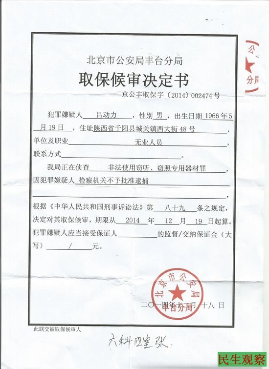 民生观察工作室2014-12-20消息:因使用窃听、窃照器材被北京丰台警方刑事拘留的陕西千阳县访民吕动力,由于检察院不予批捕,12月18日以1元钱的价格获取保释放。