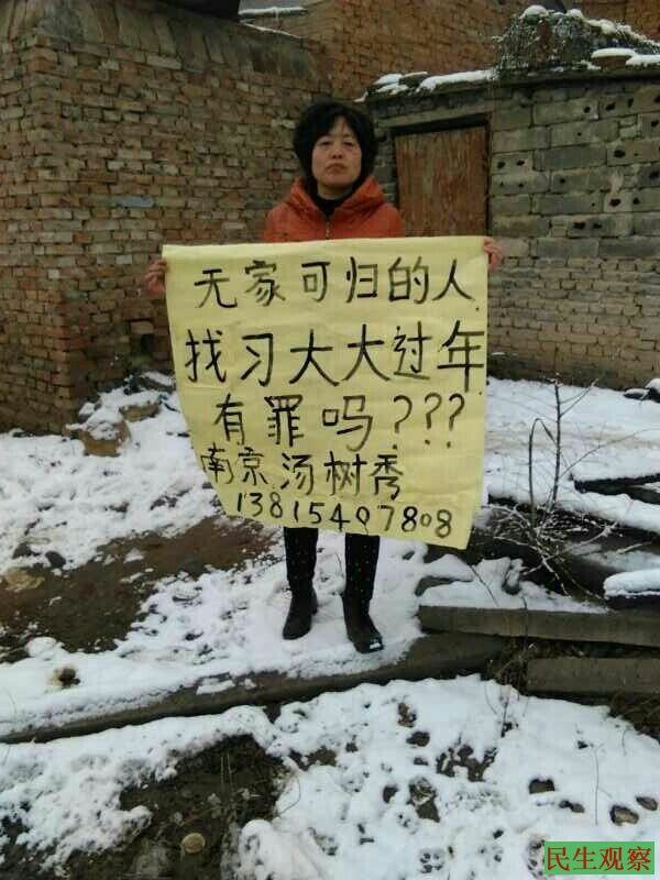 民生观察工作室2015-2-21消息:今晚,江苏新宇维权访民应立刚发来消息称,江苏南京的汤树秀到中南海给中央领导拜年被送到马家楼,遭遇了暴力截访。