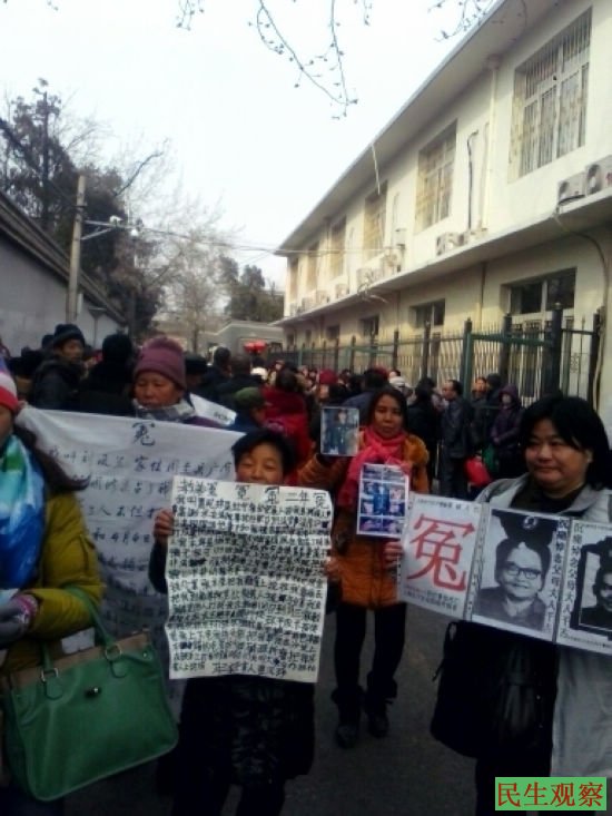 民生观察工作室2015-2-27消息:今天下午,国家信访局院内(俗称三骗胡同)聚集了千余访民,访民歌唱团今天也早早赶来,用凄苦的歌声表达对执政党的失望和怨恨,其他访民也纷纷举牌诉冤,常年流浪在京的访民无法抑制自己的愤怒,高喊“和谐社会,无家可归”。