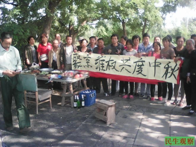 许多访民们穿着状衣,合唱上访歌,抨击着冤屈不得申的制度之恶。其中河北保定访民李桂芝在悬挂在两树之间的“聚京维权共度中秋”的条幅前拿着她写有她自己冤屈的牌子发泄心中的愤怒和无奈。