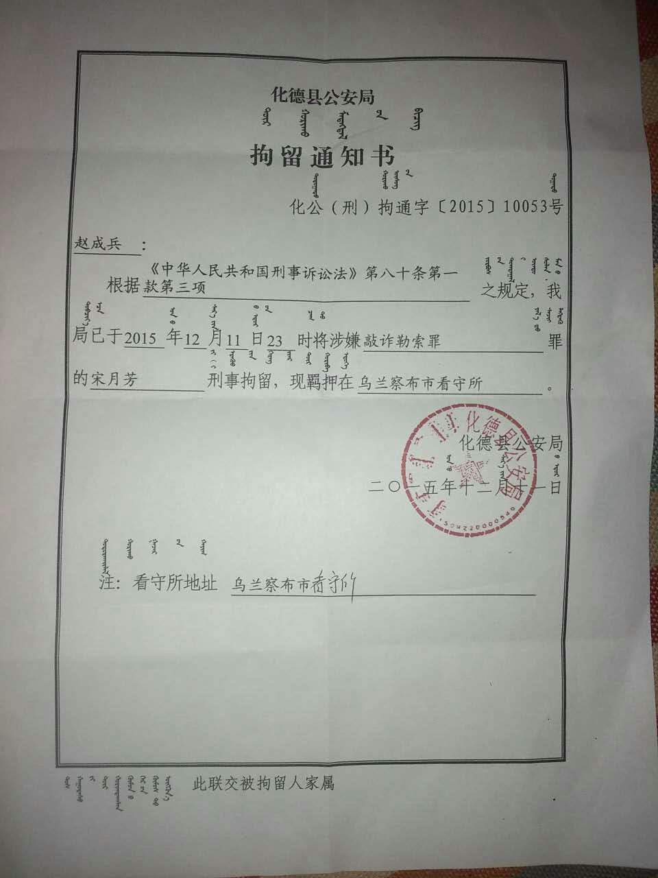 内蒙访民宋月芳被以涉嫌敲着勒索罪刑事拘留