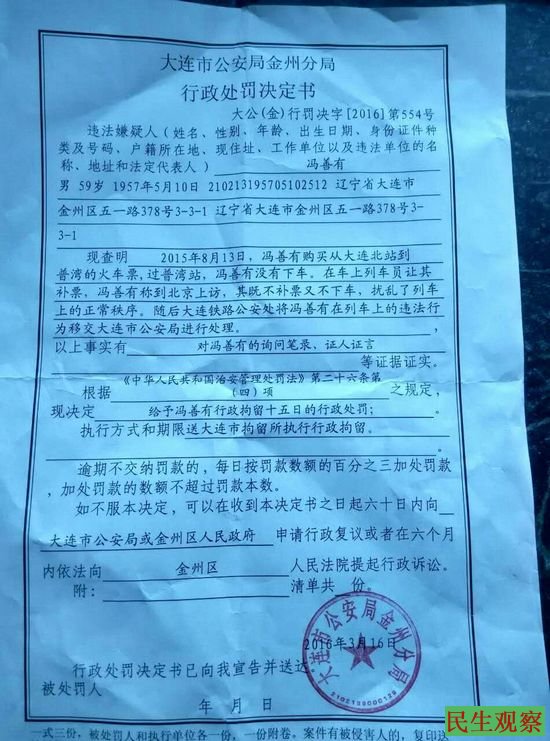 大连公安局金州分局出具的处罚决定书中记载,2015年8月13日,冯善有购买从大连北站到善湾的火车票,到善湾冯善有没有下车,在车上列车员让其补票,冯善有称其到北京上访,其既不补票也不下车,扰乱了列车上的正常秩序,随后,大连铁路公安处将冯善有在列车上的违法行为移交大连市公安局据悉处理。