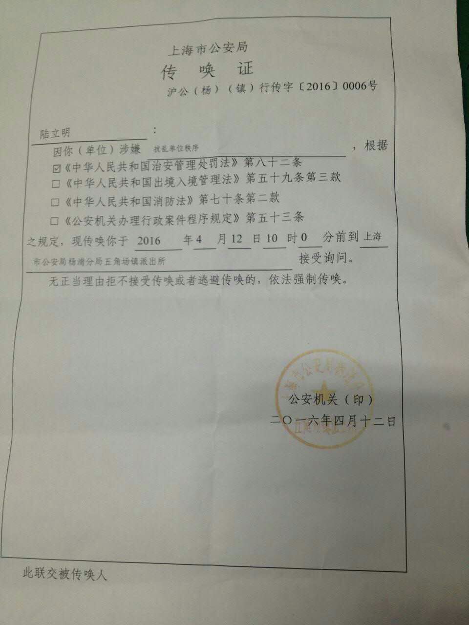 民生观察工作室2016/4/13消息:上海杨浦区访民陆立明因拒绝警方月末不到北京上访的要求4月12日被上海市公安局杨浦分局决定拘留10天,现关押在杨浦区拘留所。