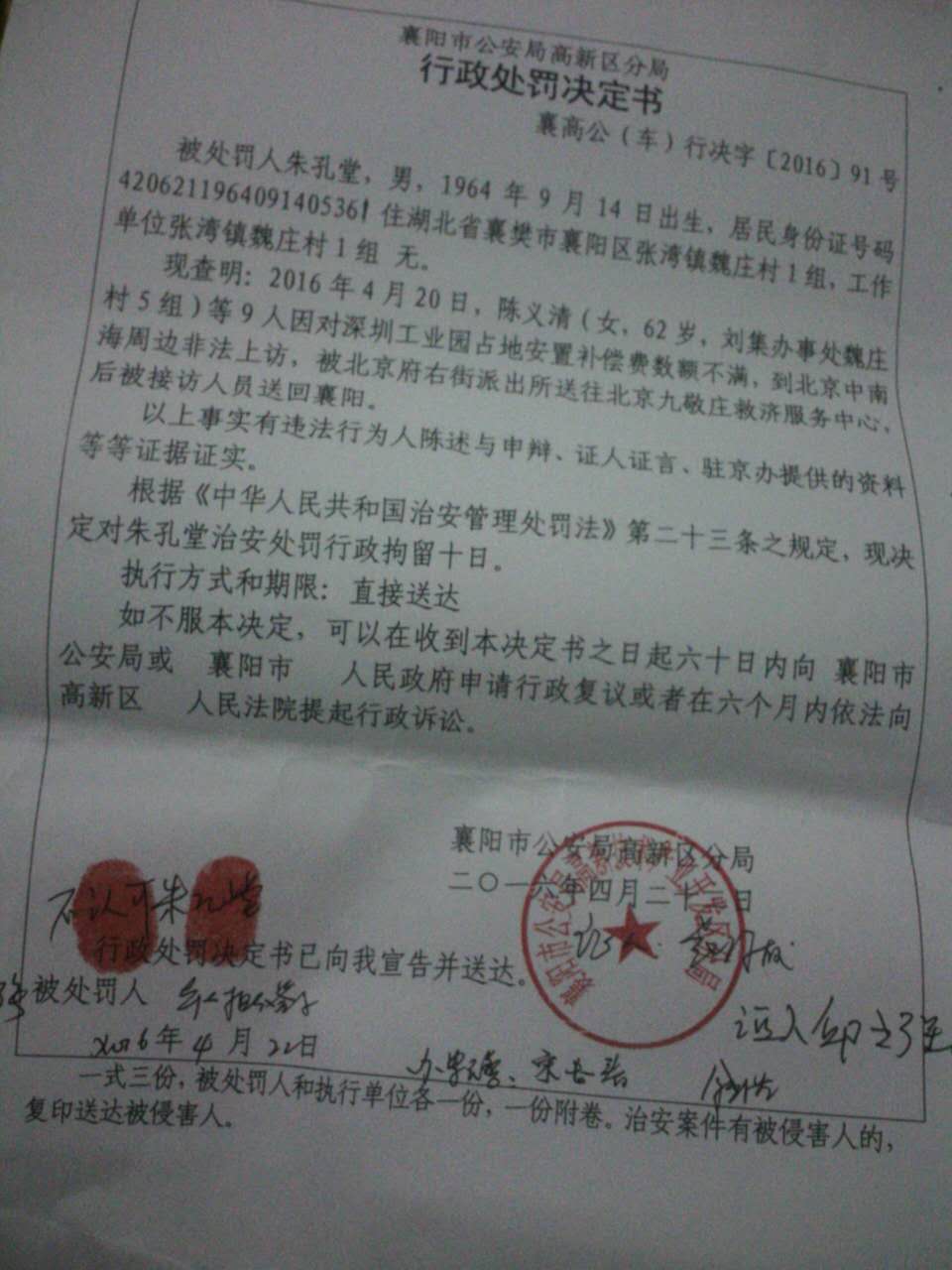 湖北朱孔堂等村民索要土地补偿款被拘留10天