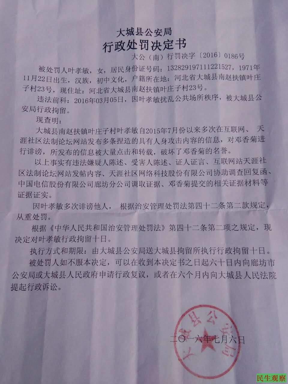 河北廊坊市访民叶孝敏被法院以侮辱罪批捕