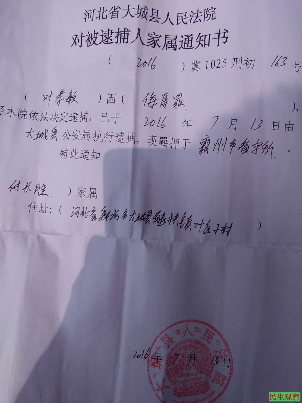 民生观察工作室2016/7/18消息:今天,网友“正气阳光”告诉本网志愿者,河北廊坊市大城县南赵府镇访民叶孝敏7月6日在北京长阳西营站公交车站点处,被地方截访的十多个人非法绑架拘留,目前已被批捕。