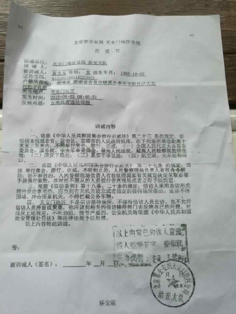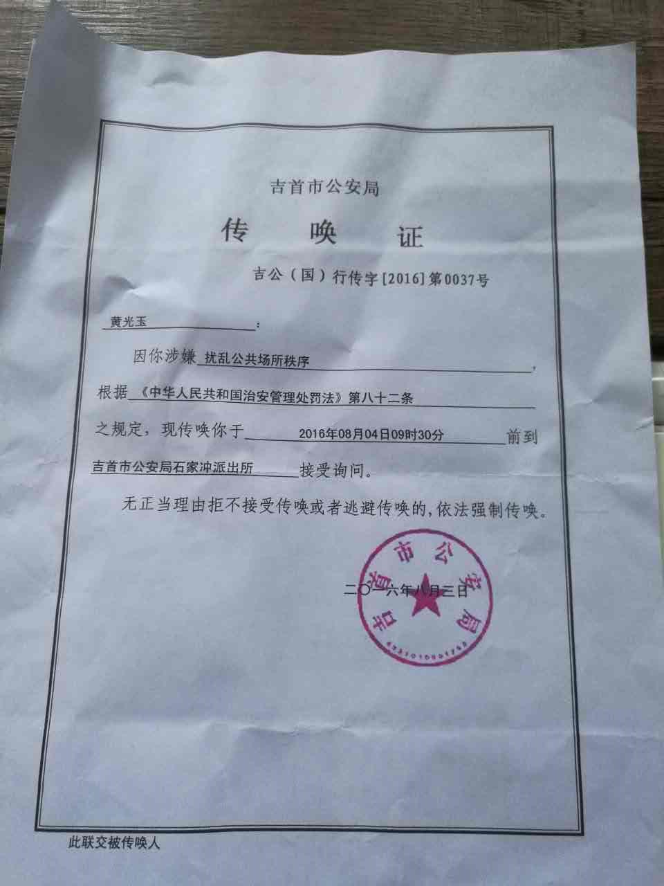 昨天,本网报道了湖南吉首市访民黄光玉北京讨说法被送天安门派出所 (http://msguancha.com/a/lanmu1/2016/0803/14712.html)随后她被天安门派出所送到久敬庄,地方政府将其接回去后吉首市公安局于今天下午对黄光玉做出拘留10天的处罚决定,理由是其到天安门非正常上访扰乱公共场所秩序。
