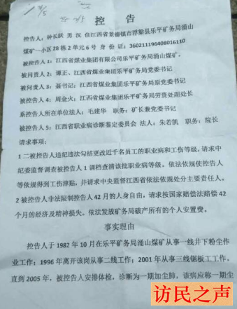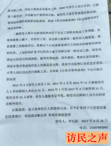 此外,江西省景德镇市浮渠县乐平矿务局职工钟长跃在煤矿工作期间从事粉尘作业而患尘肺病得不到工伤待遇而上访。钟长跃表示,尘肺病属于职业病种,但他和近千名患职业病职工却得不到工伤待遇。他到天安门上访,遭到截访人员软禁、威胁。