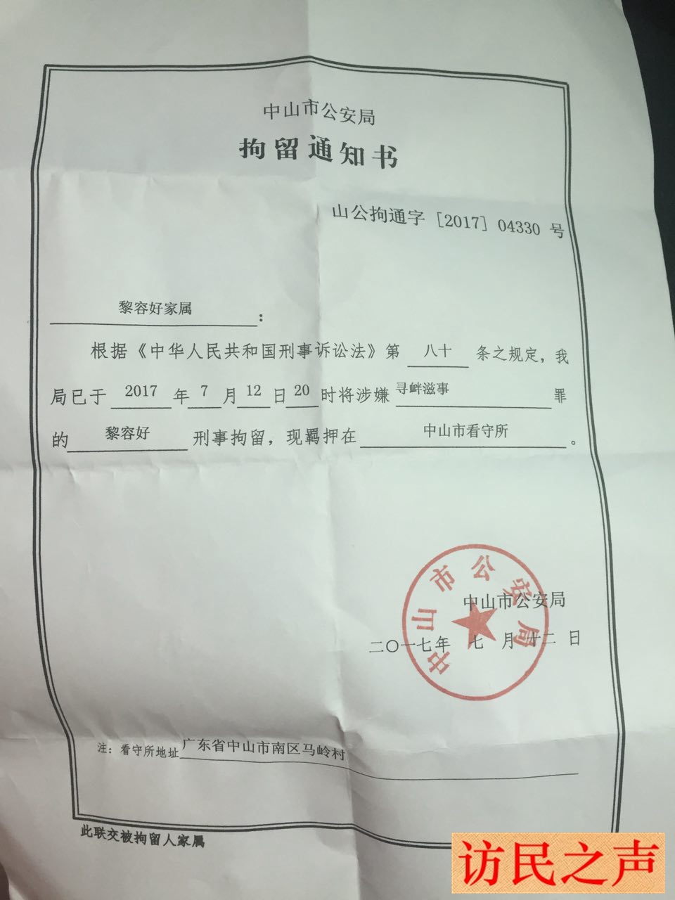 [访民之声2017/7/13消息] 在京遭抓捕失联多日的广东中山市小榄镇访民梨容好,昨天被中山市公安局以涉嫌寻衅滋事罪刑事拘留,羁押于中山市看守所。