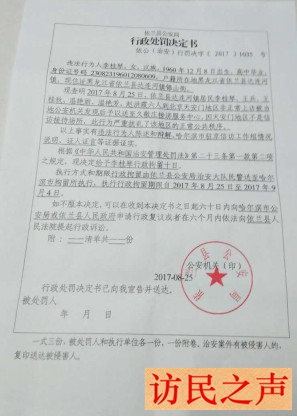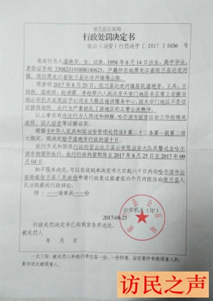8月25日,依兰县公安局出具的处罚决定书中显示,温艳芳、温艳丽、赵红霞、李桂琴、王兵、王桂秋六人到北京市天安门地区非正常上访,被北京公安机关发现予以送到久敬庄接济服务中心。因天安门地区不是信访接待场所,此行为严重扰乱了该地区的正常公共秩序,故给予行政拘留10日处罚。