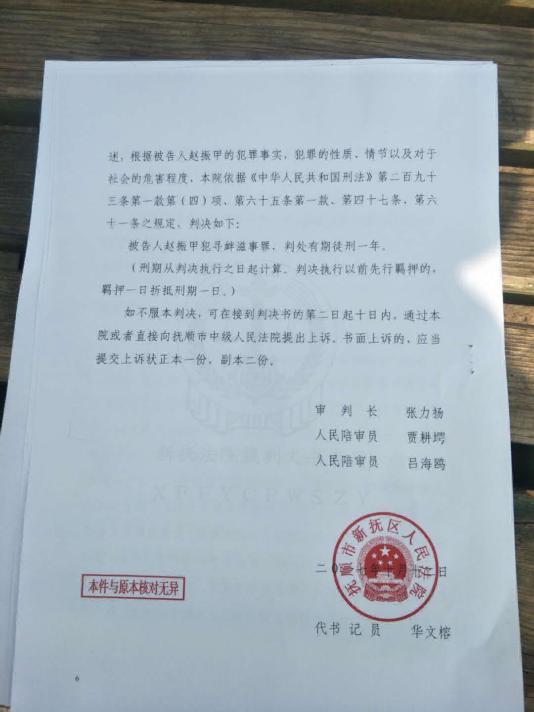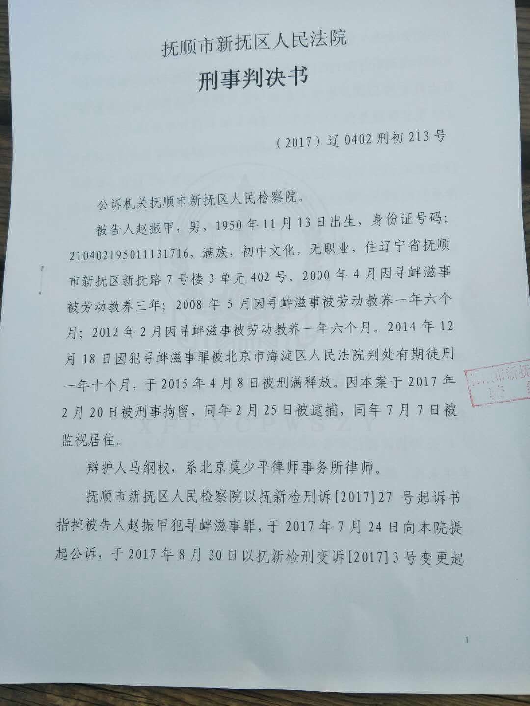 该案在开庭两个月后于今天传出判决结果,赵振甲被判有期徒刑一年。根据判决书显示,新抚区检察院指控赵振甲的犯罪事实总共四起:1,2016年4月18日在北京市西城区西长安街25号附近非法集会、扰乱社会秩序;2,2017年1月26日在北京上访期间扬言到国家领导人住处放鞭炮;3,2017年2月1日在北京中南海周边上访;4,2017年2月7日在敌对网站《新唐人网》发文煽动组织“反截访”签名活动。对四起犯罪事实的指控,尽管辩护律师都作了无罪辩护,但法院最终只采纳了部分辩护观点,仅认定其中的两起犯罪事实不能成立,即对指控2017年1月26日在北京上访期间扬言到国家领导人住处放鞭炮及2017年2月7日在敌对网站《新唐人网》发文煽动组织“反截访”签名活动的犯罪事实,法院认为证据不足而撤销,但仍然用余下两项“犯罪证据”指控赵振甲“寻衅滋事”罪成,判决一年有期徒刑,即时执行。