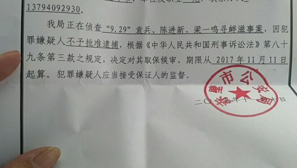 今天下午梁一鸣告诉本网人权观察员,10月3日她和陈剑雄、袁兵三人一起被带到赤壁市公安局,次日被以涉嫌“寻衅滋事罪”刑事拘留,羁押在赤壁市看守所。刑拘将近四十天后,今天梁一鸣从赤壁看守所被取保候审获释,并收到赤壁市检察院发出的“不予批准逮捕通知书”,同时由户籍地广东赶来的警察贴身陪同,被强制遣送回广东老家。和广东警察一起前去赤壁接人还有梁一鸣弟弟。