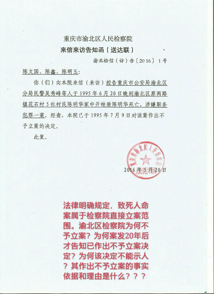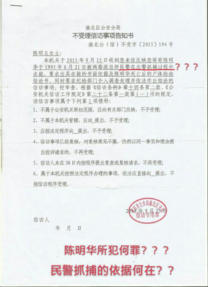 陈明华死后,渝北区公安分局迅速将其尸体强行火化,且以家属照了尸体照片为由扣留陈明华骨灰至今。陈明华家人向各级公安、检察院、政法委、人大等部门投诉控告直至进京上访,要求依法立案查办代祥云、吴秀峰等凶手,并公开击毙陈明华真相。渝北警方称,陈明华因抗拒传唤在抓捕过程中被击毙,而家属要求公开尸检报告、枪支检验报告、现场照片、归还陈明华骨灰至今无果,各部门均不予立案受理。如今陈明华已含冤屈死23年,尸骨至今无法入土为安!