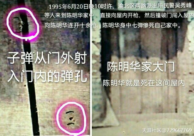 据悉,陈明玉的哥哥陈明华是重庆市渝北区两路镇花石村村民,29岁的时候被重庆市渝北区公安分局两路镇派出所民警吴秀峰、苏德怀等人闯入家中乱枪击毙。事情经过:1995年5月18日,陈明华因耕地用牛问题和另一名农民(代祥云)发生冲突,该名农民受了轻伤,因此要求陈明华赔偿,但陈明华拒绝。随后该农民就在夜晚找了两名民警威胁他赔偿,并向陈明华开了10几枪,致使他身中7枪惨死家中。