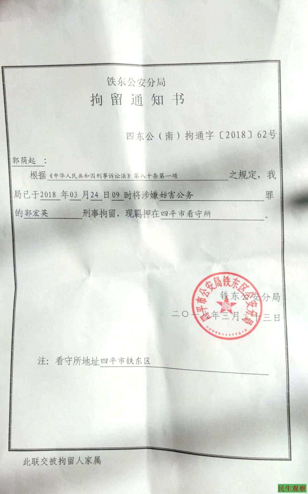 【民生观察2018年3月24日消息】本网获悉,吉林省四平市铁东区维权人士郭宏英,于2018年3月24日,被吉林省四平市公安局铁东区分局以涉嫌妨害公务罪刑事拘留。