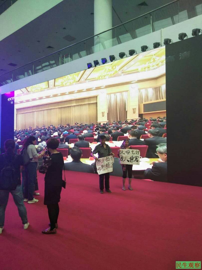 虽然当局稳控升级,但冤民不畏强权仍然前仆后继来峰会举牌诉冤,昨天残疾冤民雷宗林(已拘押在福州第一看守所一年多)的父母,举牌在峰会展台上诉冤。冤民魏英、林兰英、陈光等人也出现在峰会现场,寻机诉冤。