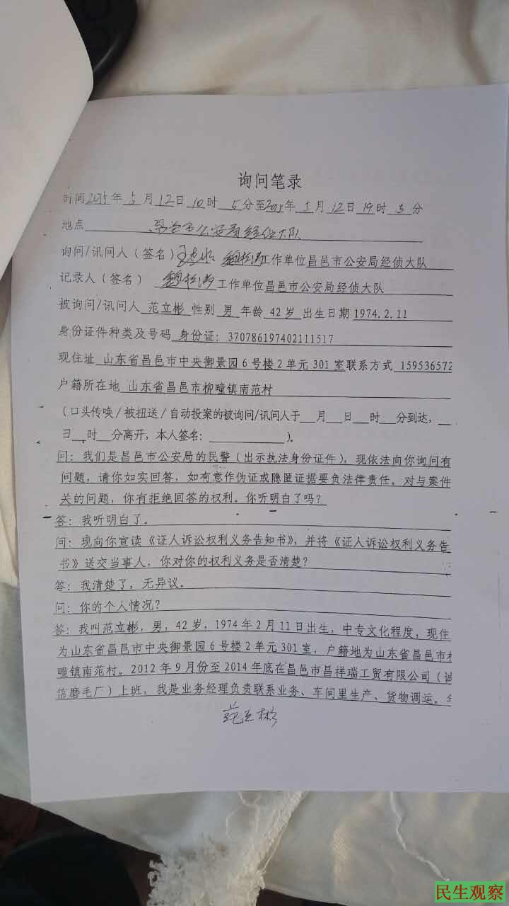 报案后,昌邑市公安局经侦队办案人员魏松涛等人于4月22日来昌祥瑞公司调查案情,5月12日询问并做了笔录,范立彬、高永胜、郭红等人均承认通过造假账,侵占昌祥瑞公司货款45万元。