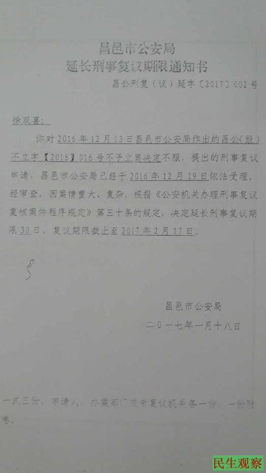 2017年1月18日,昌邑公安局下发通知书,称因案情重大、复杂,决定延长刑事复议。