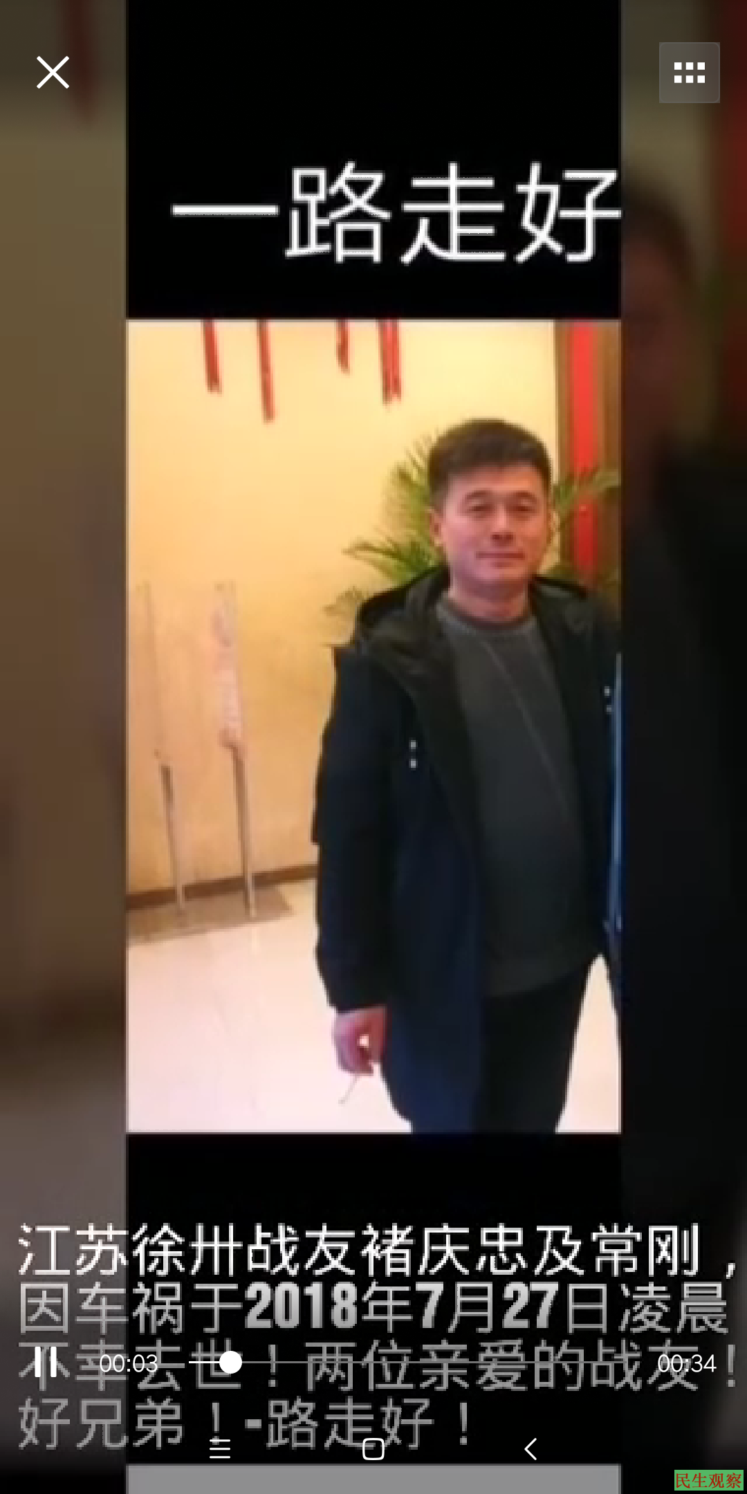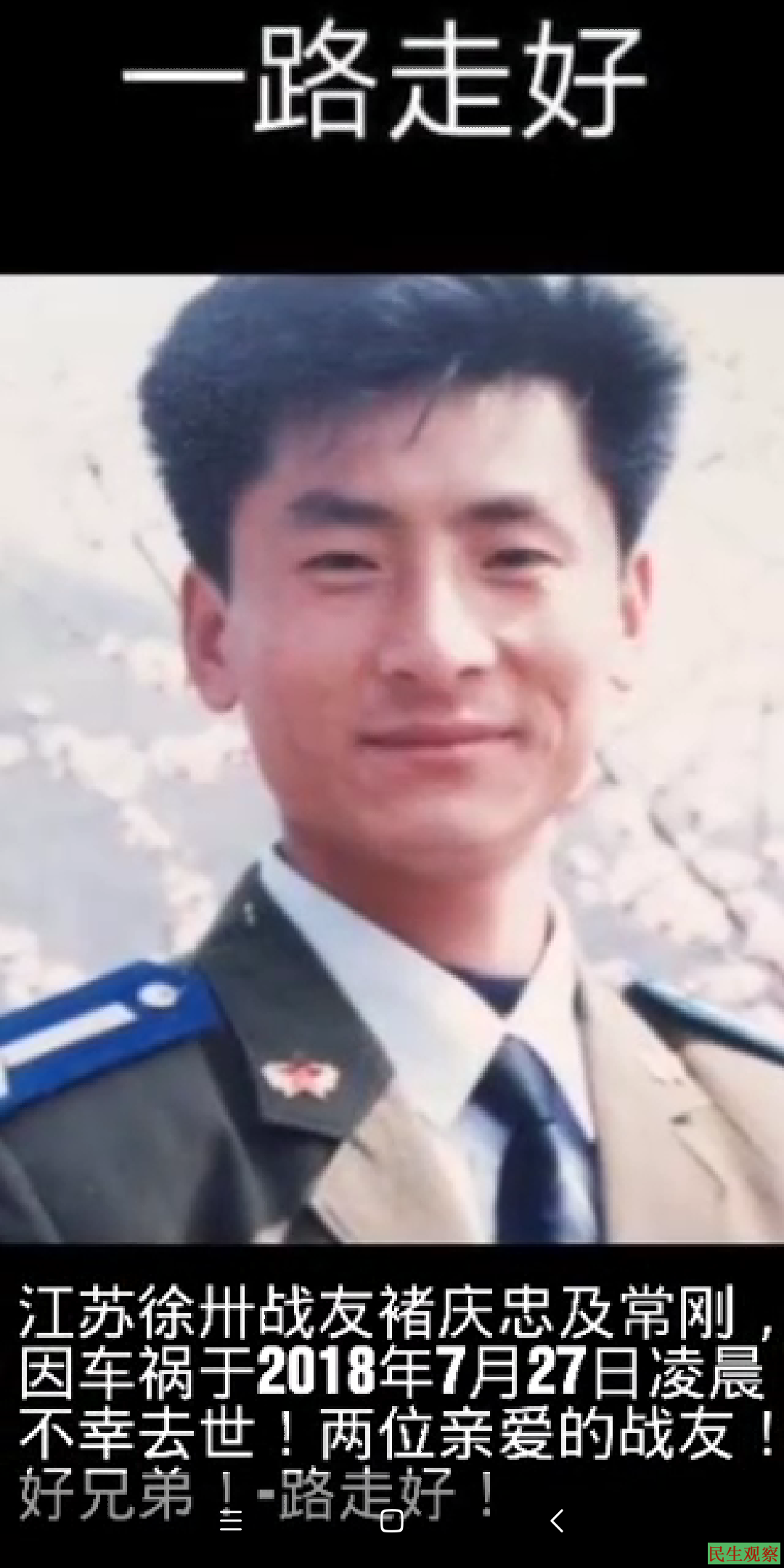 【民生观察2018年7月28日消息】本网获悉,江苏徐州退役老兵褚庆忠、常刚两位老兵于7月27日凌晨从退役军人事务部上访后在回徐州的路上,遭遇车祸不幸离世。