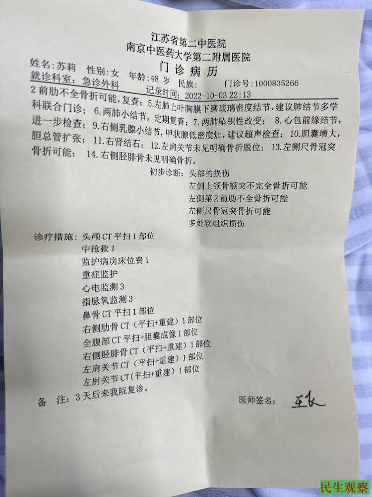 2022年10月5日,是苏莉被不明身份者暴打后的第三天,其自述:左侧上腭骨骨折,进食艰难;医院依然不给治疗,不给检查报告,并催促她出院;目前警方不给任何说法。