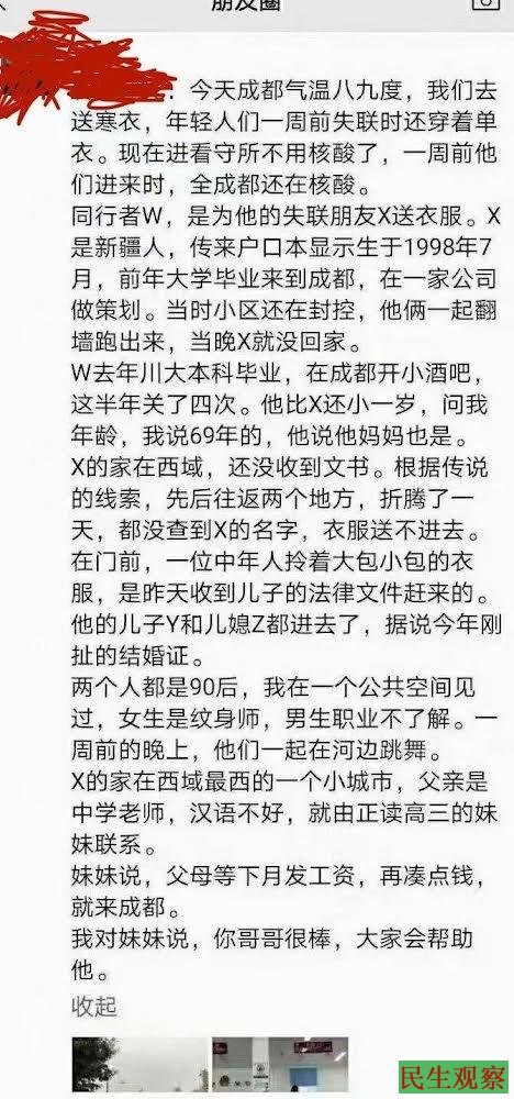 同行者W,是为他的失联朋友X送衣服。X是新疆人,传来户口本显示生于1998年7月,前年大学毕业来到成都,在一家公司做策划。当时小区还在封控,他俩一起翻墙跑出来,当晚X就没回家。