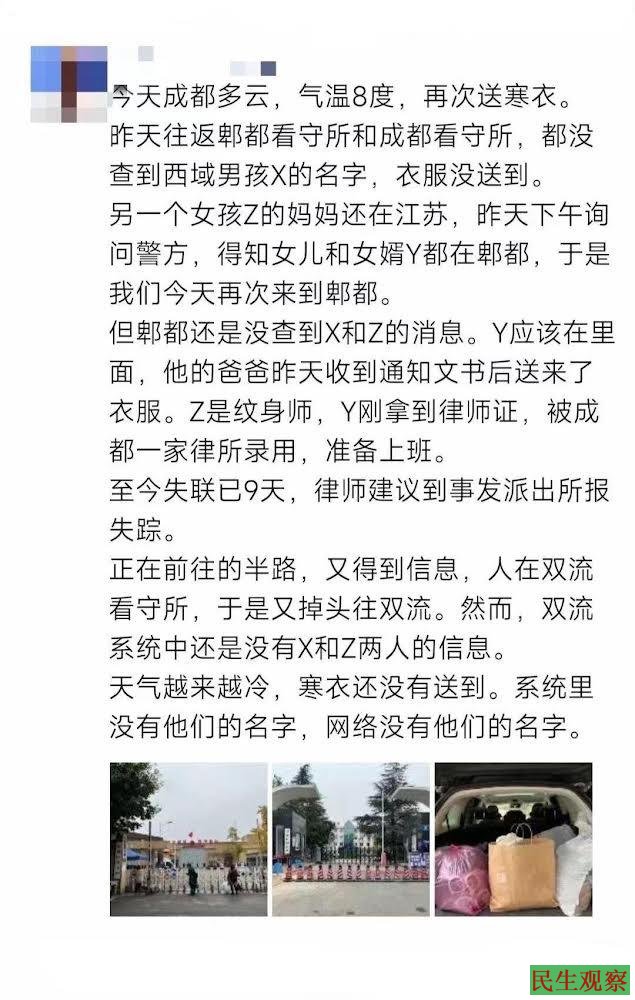 但郫都看守所还是没查到X和Z的消息。Y应该在里面,他的爸爸昨天收到通知文书后送来了衣服。Z是纹身师,Y刚拿到律师证,被成都一家律所录用,准备上班。