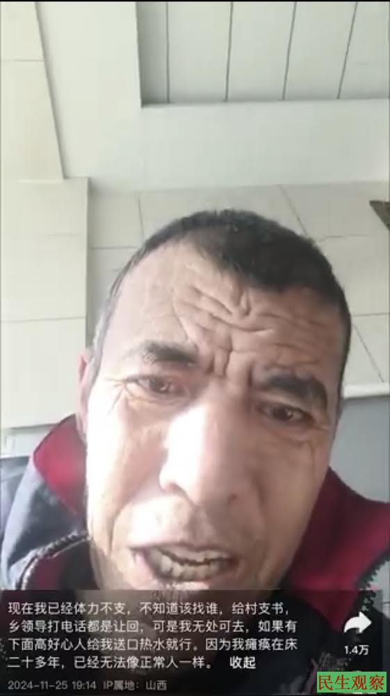 【民生观察2024年11月28日消息】2024年11月25日,山西朔州。一男子发文求助,称在2004年因工伤导致残疾,妻子于2015年走失,父母相继去世,居住的房子也在2022年塌陷。目前儿子一直没有工作,生活举步维艰,家里因未交费面临停水停电停暖,曾多次求助政府,不仅未果还遭到领导威胁。男子表示:受伤前一分公粮都没少交,实在对政府感到失望。