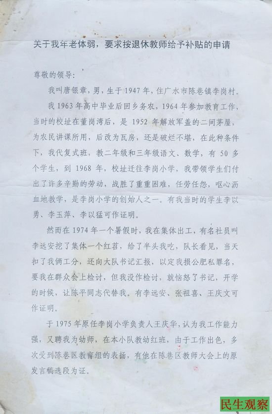 民生观察工作室2013-7-1消息:近日,本工作室接到湖北省广水市民办教师唐银章的大量材料,唐老师反映,1964年他开始在广水市农村任民办教师,1974年,因别人偷了红苕,给了半头他吃,他被辞退回家。