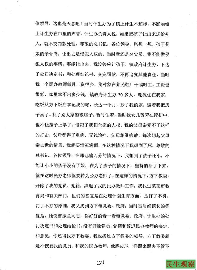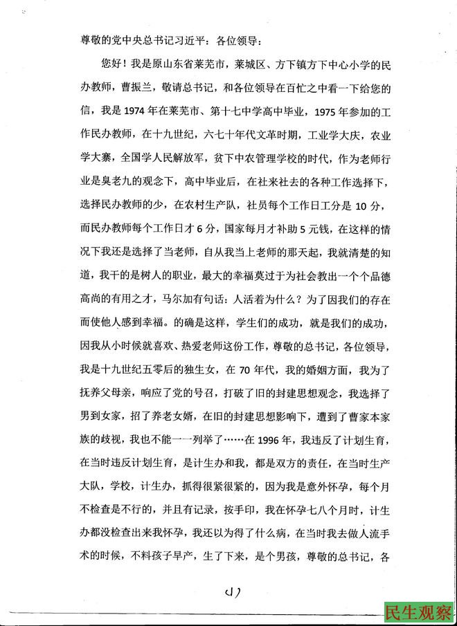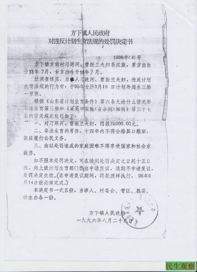 山东曹振兰“超生”遭抄家罚款 重复处理任教二十多年被辞退