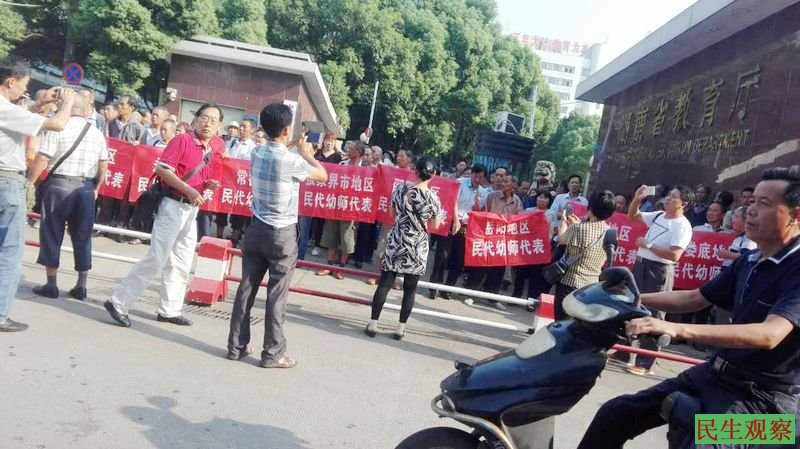昨天,湖南省各个地市州县的民办代课幼儿教师纷纷来到湖南省教育厅请愿讨说法,要求解决老师们的身份、老有所养、病有所医的问题。据现场老师介绍,昨天在湖南教育厅门口,8:30分各个地方县市的民代幼老师集聚在一起,大家按各属地分排 站列,打出了各地方的标语,到场老师有来自张家界、岳阳、常德、娄底等各地。