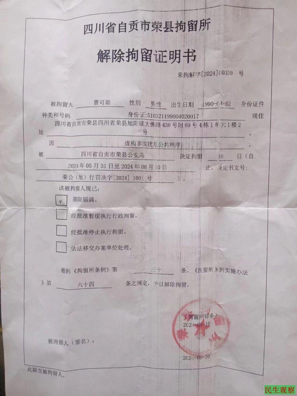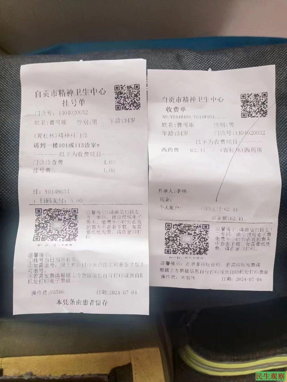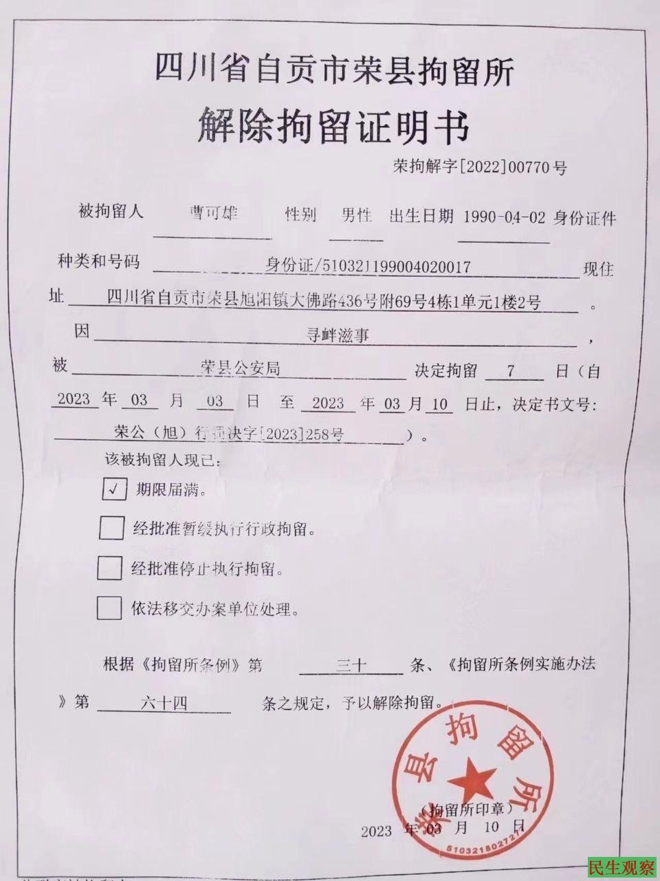 【民生观察2024年9月25日消息】四川省自贡市荣县诗人曹可雄,近年来大量创作抨击时政的诗歌,在微信群发表。于2023年3月3日被荣县公安局处行政拘留7天。2024年5月31日被荣县公安局处行政拘留10天。2024年6月11日被荣县公安局强制送往自贡市第五人民医院(精神病院)治疗,直到7月4日被释放,在精神病院有被电疗,强迫吃药。