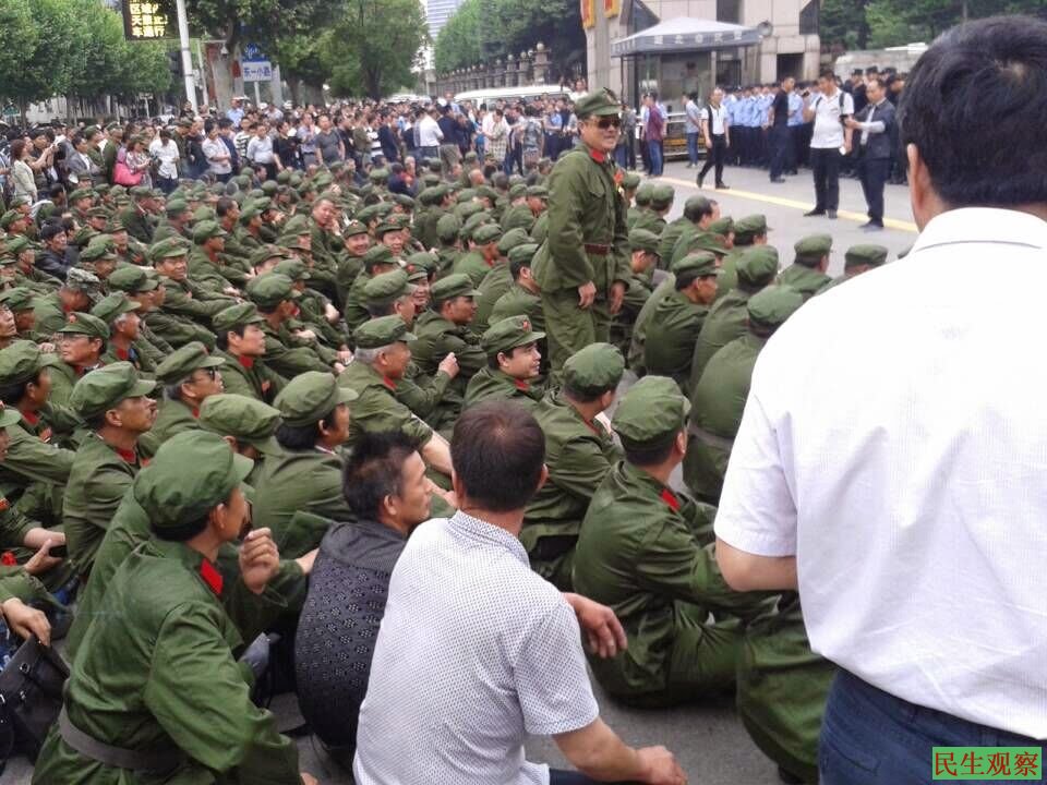民生观察工作室2015/5/4消息:今天是周一,湖北各地大批参战老兵齐聚湖北省政府前静坐抗议,要求解决他们退伍待遇等问题。