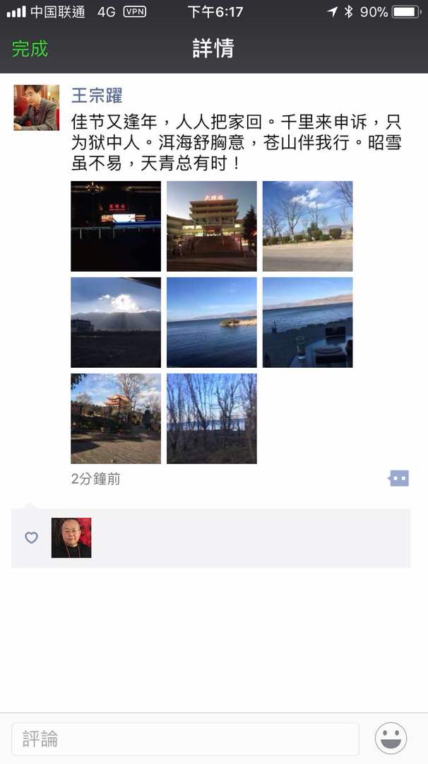 据悉,自从去年(2017年)12月5日卢昱宇与父亲会见时,卢昱宇曾明确表示过“请王宗跃与肖律师尽快介入申诉”。而今,时隔两个多月,委托律师王宗跃在春节前夕不辞辛苦千里迢迢来到大理,争取会见卢昱宇时,却遭到大理狱方如此刁难。对此,王宗跃律师一腔愤怒无处倾泻,无奈中作诗一首:“佳节又逢年,人人把家回。千里来申诉,只为狱中人。洱海舒胸意,仓山伴我行。昭雪虽不易,天青总有时。”以此表达内心的悲愤与感慨。