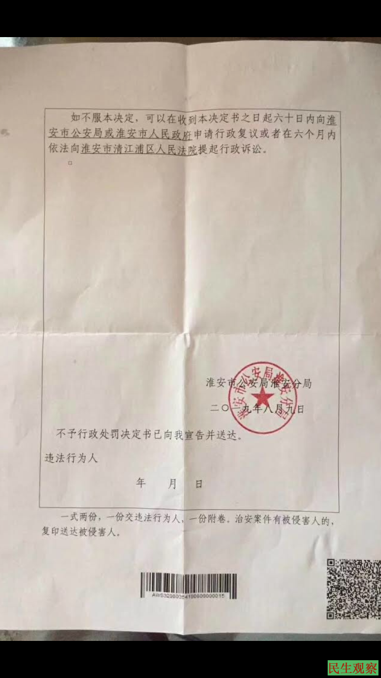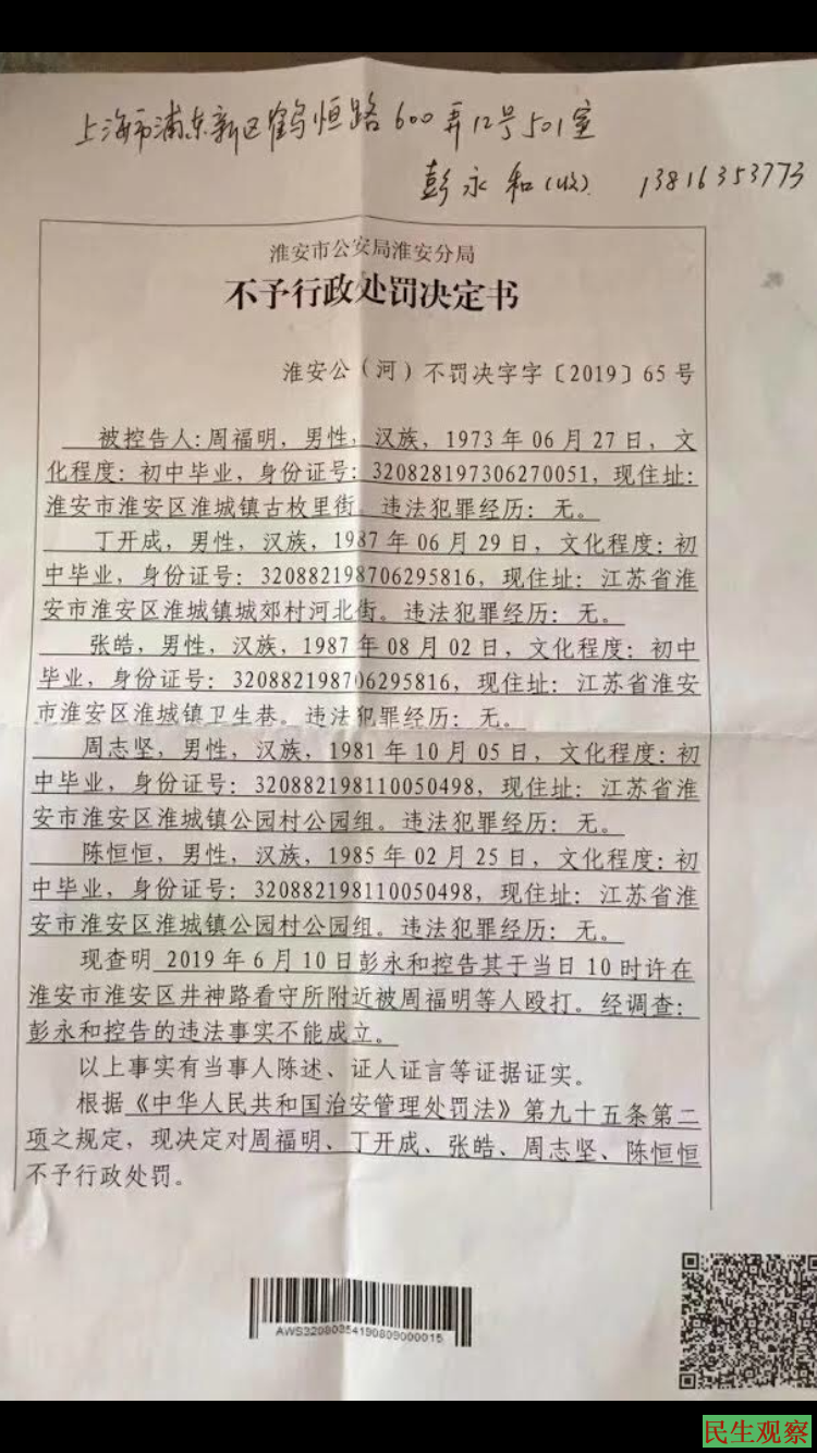据悉,彭永和律师近日收到江苏淮安市公安局淮安区分局于8月9日作出的《不予行政处罚决定书》,作为对彭永和控告自己于6月10日上午十时许在淮安区看守所附近遭到几名不明身份人士无故殴打并受伤一案的书面回复。