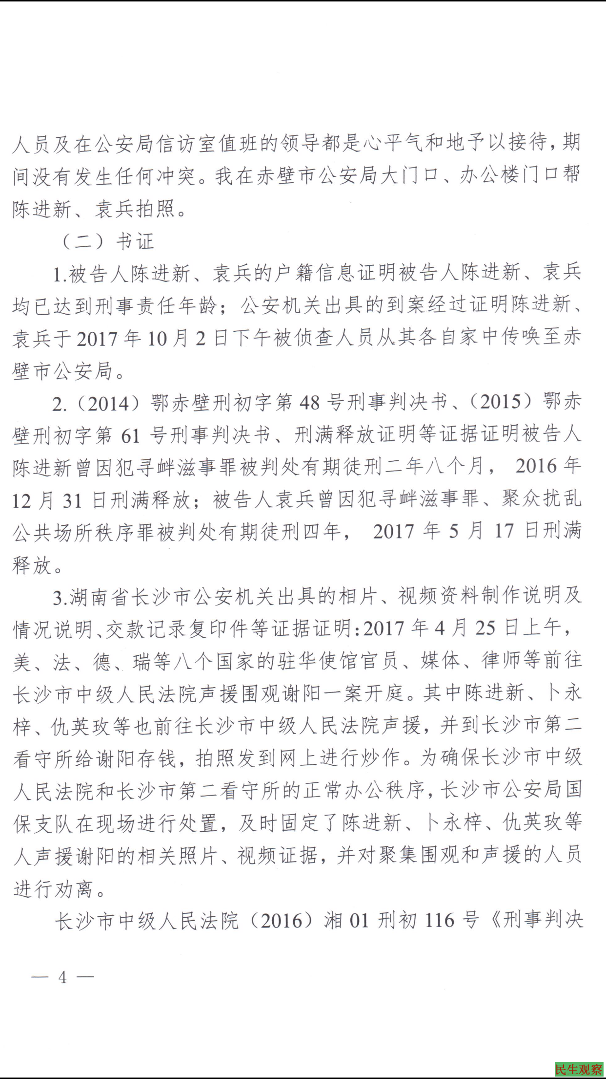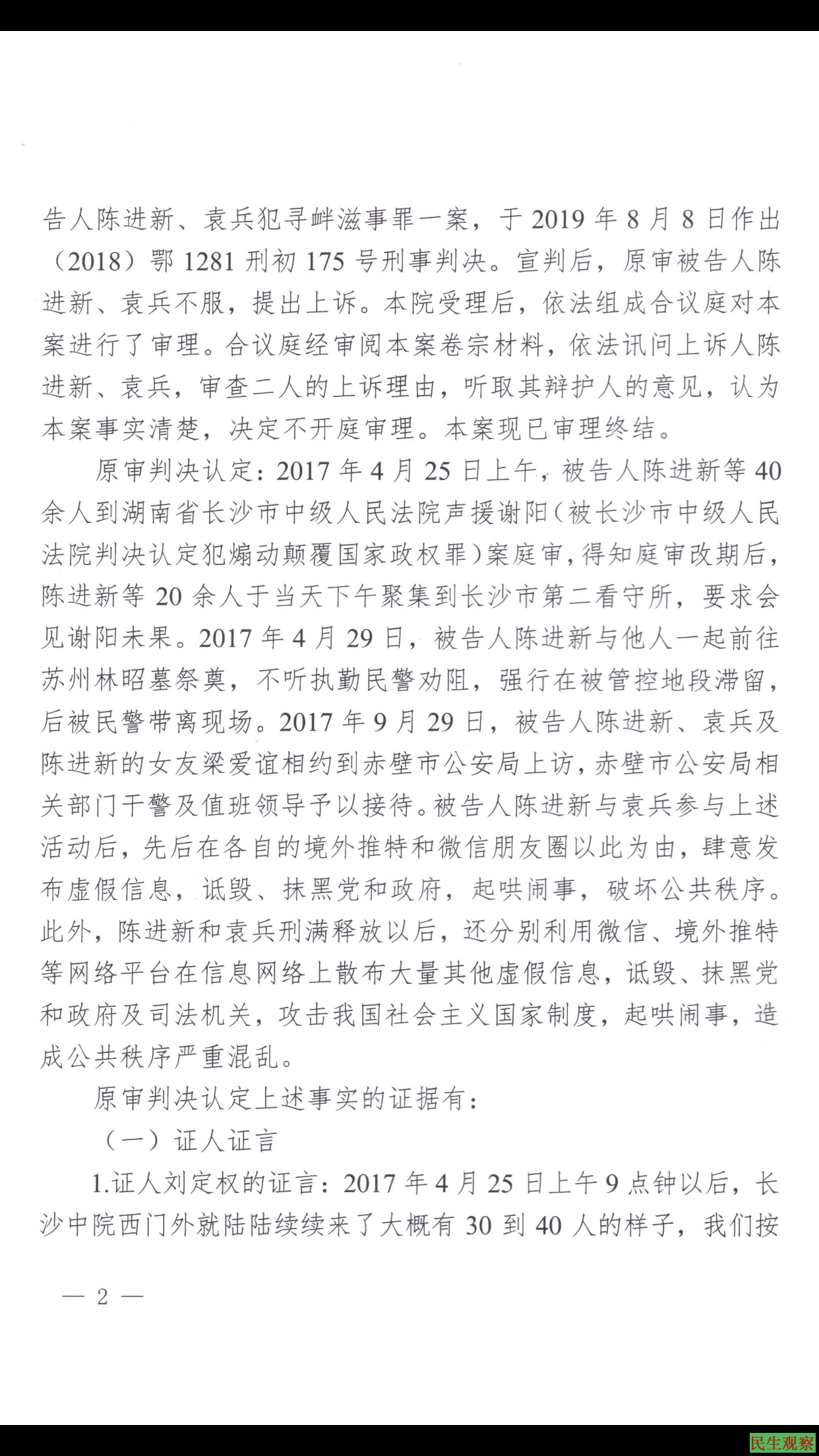【民生观察2019年10月28日消息】本网获悉,南方街头运动践行者、赤壁五君子之 陈剑雄、袁兵,两人涉嫌“寻衅滋事罪”上诉一案,湖北省咸宁市中级人民法院于 10月22日下达判决,驳回二人的上诉,维持陈剑雄原判三年六个月,刑期至2021年4月2日;维持袁兵原判三年,刑期至2020年10月2日。